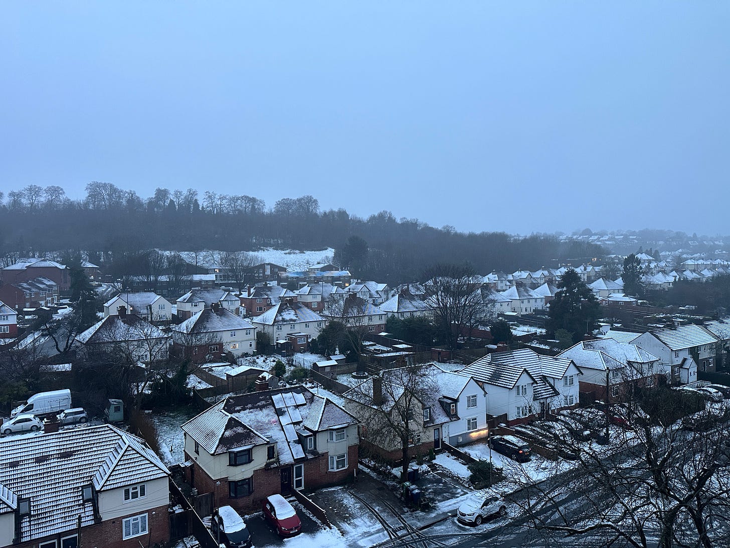 Let’s talk about weather—when we arrived last February we were told that it hadn’t snowed all winter, and we never had any snow last year. We were also told by locals that it hadn’t really snowed in a few years, but that if it did, everything would come to a standstill because Brits don’t like to drive in the snow and there are a lot of hills to navigate. So we were surprised one Sunday morning to wake up to snow! By Utah standards, or by California Sierra standards, this snow wasn’t much of anything. But it was enough to do just what we had been told—bring everything to a standstill, at least for a few hours. Which meant they cancelled Church! A snow day! While we missed seeing everyone, I have to say it was kind of nice to just stay in and be cozy. The snow was pretty much melted and gone by midafternoon.
