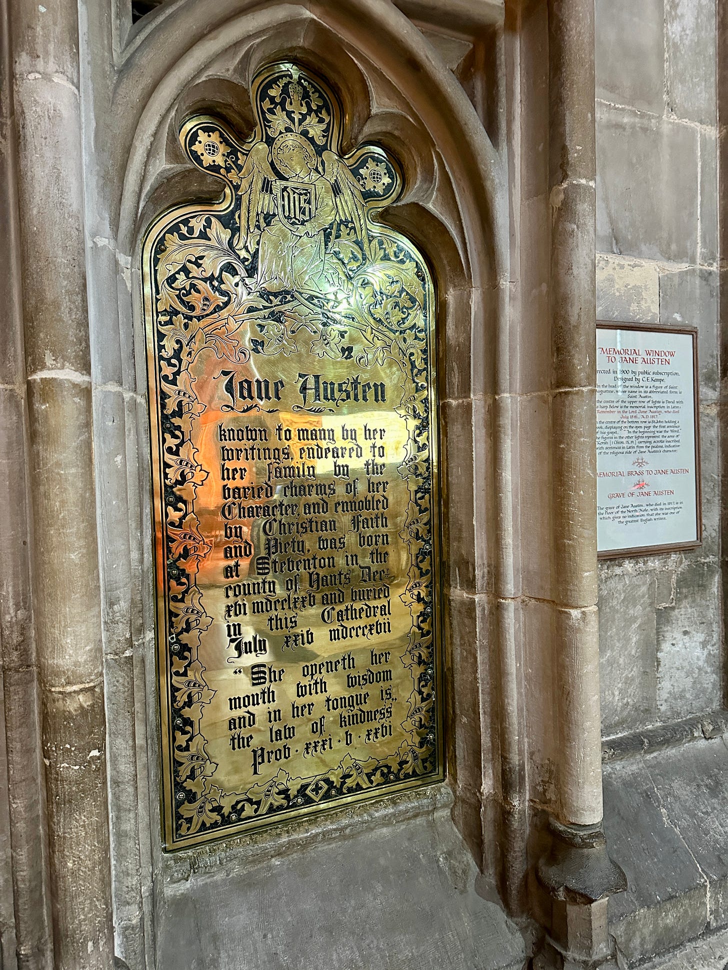 In memory of Jane Austen…The benevolence of her heart, the sweetness of her temper, and the extraordinary endowments of her mind obtained the regard of all who knew her; and the warmest love of her intimate connections. Their grief is in proportion to their affection, they know their loss to be irreparable, but in their deepest affliction, they are consoled by a firm though humble hope that her charity, devotion, fiath and purity have rendered her soul acceptable in the sight of her Redeemer.
