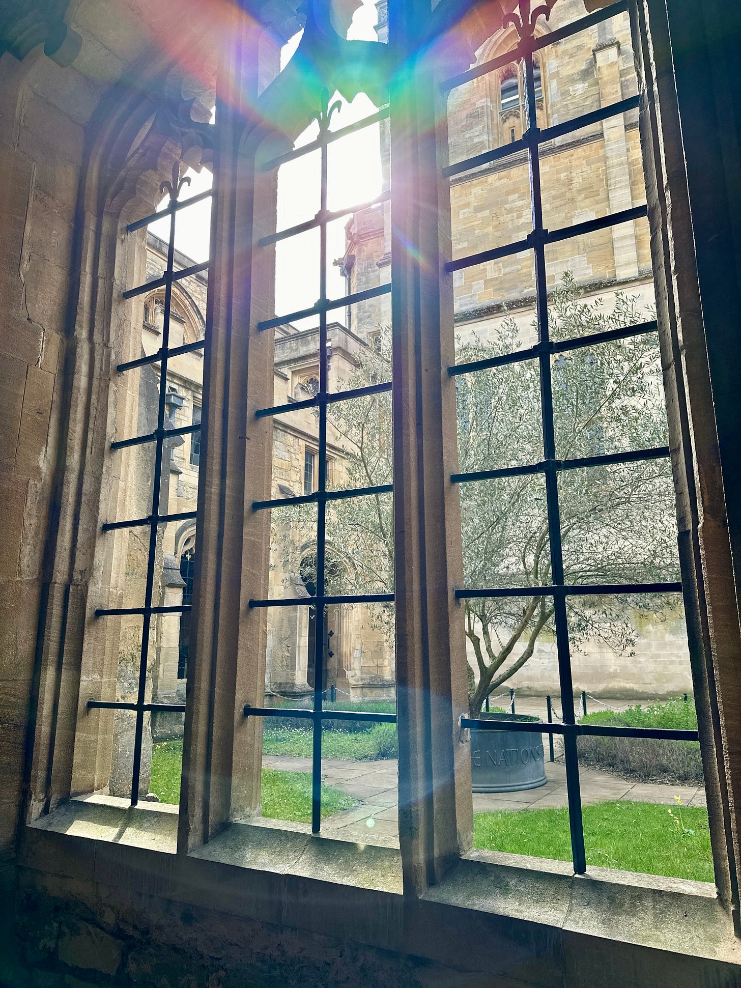 Going back to rainbows, this last picture was taken in the Cloisters at Christ Church College at Oxford (I adore Oxford and if you come visit us, that will be high on my list of places I’d want you to see!). Any true Harry Potter fan will know this was a filming location for one or more of the movies—I like Harry Potter and all, but that’s not what really interests me about these beautiful old buildings. I just love the architecture and the history behind them. I love imaging what life must have been like when these buildings were first built. I don’t think I would have wanted to live way back then, but it’s fascinating to think about. I caught a glimpse of this rainbow light being refracted (is that the right word?) through the windows, which actually aren’t even windows but just bars over window-like openings and I did my best to capture it.